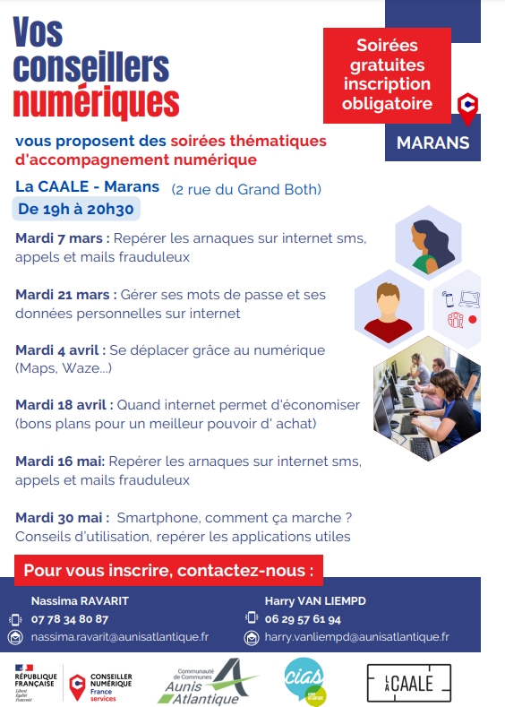 - Deux conseillers numériques recrutés au CIAS d’Aunis Atlantique vous reçoivent sur rendez-vous lors de permanences gratuites organisées au plus près de chez vous en partenariat avec les communes volontaires.